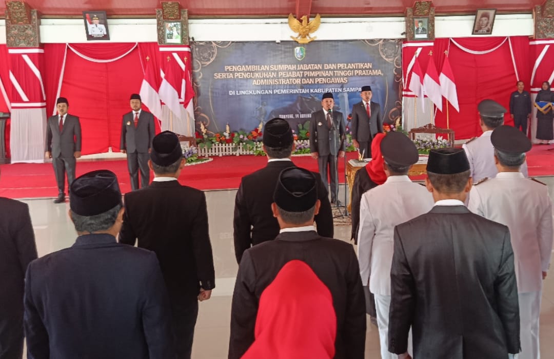 SAMPANG, Beritalima.com | Sebanyak 65 pejabat di lingkungan Pemerintah Kabupaten Sampang resmi dilantik. Komposisinya terdiri dari 11 Jabatan Pimpinan Tinggi (JPT) Pratama, satu di antaranya menjalani evaluasi karena sudah menjabat lima tahun, yakni Wahyu. Selain itu terdapat 10 pejabat yang dimutasi, serta 54 pejabat administrator dan pengawas yang sebelumnya dikenal sebagai eselon III dan IV.