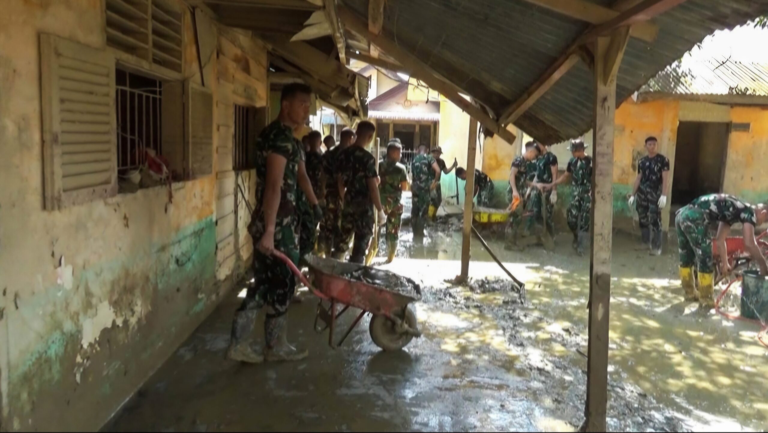 Pembersihan difokuskan pada material lumpur yang menumpuk di halaman depan sekolah akibat banjir yang melanda wilayah tersebut. Endapan lumpur dinilai mengganggu aktivitas belajar mengajar serta berpotensi membahayakan keselamatan siswa dan tenaga pendidik. Dengan penuh semangat, para Taruna bahu-membahu membersihkan area sekolah agar dapat kembali digunakan secara aman dan layak.