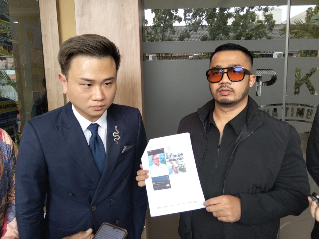 Teks Foto: Nadhima Fitrangga (kanan) bersama kuasa hukumnya, Michael Sugianto, Managing Partner Ansugi Law, mengadukan sejumlah akun yang menyebarkan kutipan hoaks Zulkifli Hasan.