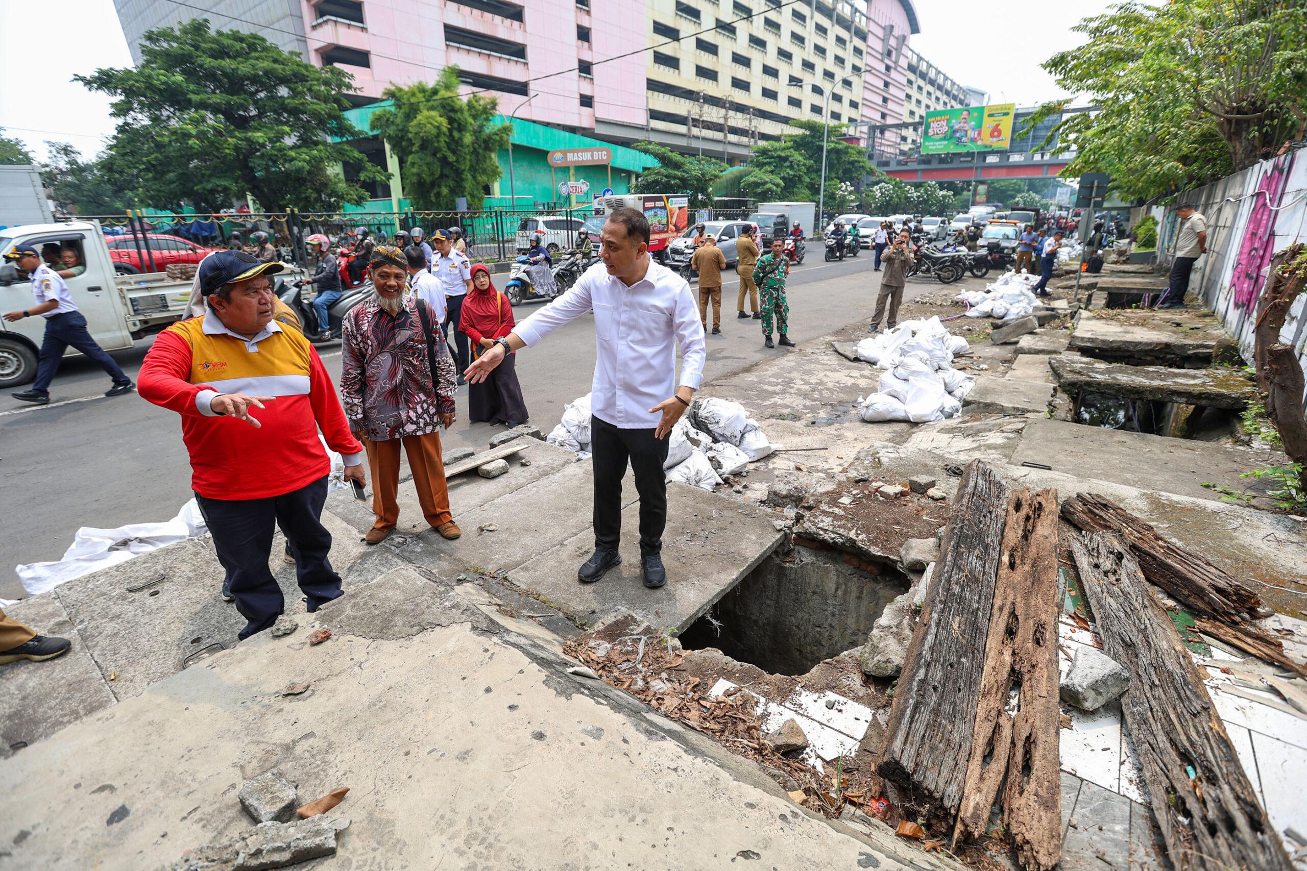 “Jalan ini akan kita aspal sehingga jalur di sini lebih lebar untuk mengurai kemacetan yang dari arah Jagir maupun dari arah Hotel Novotel. Karena kan biasanya bisa macet sampai di sana sampai ke arah traffic light ini,” kata Wali Kota Eri.