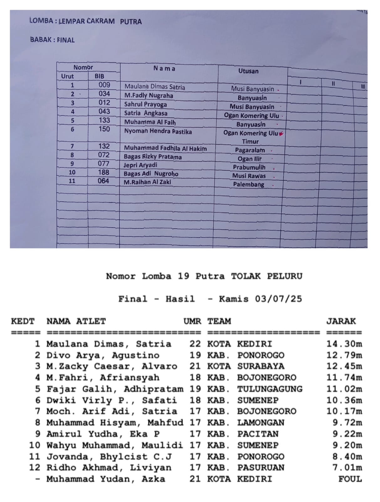 Maulana Dimas Satria disebut tampil membela Kabupaten Muba pada cabang olahraga atletik nomor lempar cakram. Namun berdasarkan data resmi Porprov Jawa Timur ke-IX yang baru saja digelar, nama yang sama tercatat sebagai atlet kontingen Kota Kediri (Nomor Urut 1) dan bahkan berhasil meraih medali emas dengan lemparan sejauh 14,30 meter.