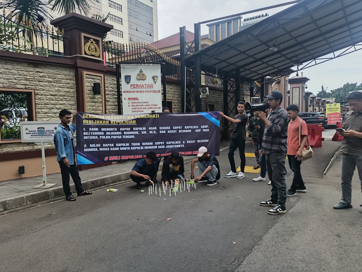 JAKARTA – Ratusan Mahasiswa yang tergabung dalam Gerakan Mahasiswa Pemerhati Kebijakan Kepolisian (GMPKK) menggelar Aksi solidaritas terhadap Media Papuanewsonline.com di Papua yang dibungkam oleh Polres Mimika, Polda Papua Tengah, di depan Gedung Mabes Polri, Jakarta Selatan, Rabu (1/10/2025).