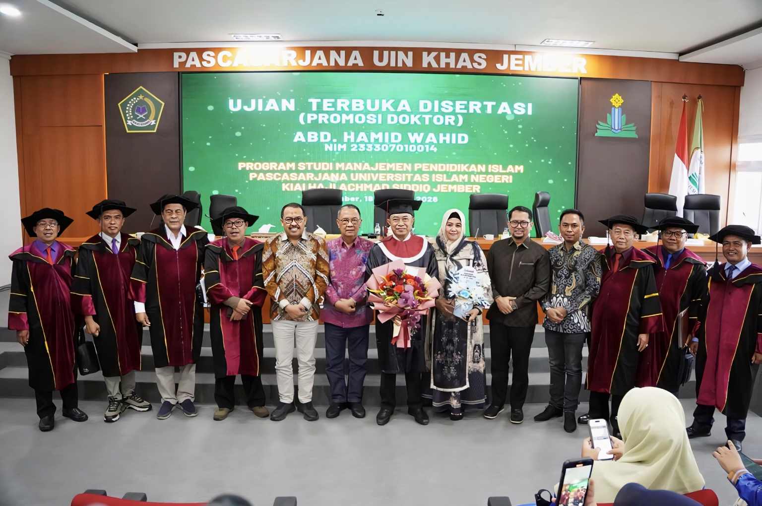 Sidang doktoral itu dipimpin Dr. H. Saihan, S.Ag., M.Pd.I., dengan Prof. Masdar Hilmy, MA., Ph.D., sebagai Penguji Utama, bersama tim promotor dan penguji dari kalangan akademisi manajemen pendidikan Islam.