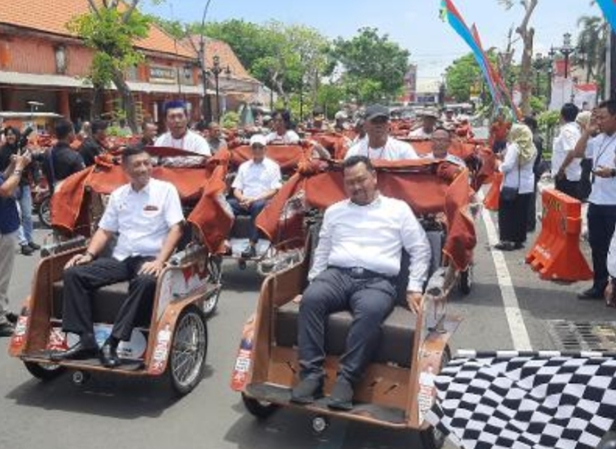 Usai penyerahan, kegiatan dilanjutkan dengan konvoi becak listrik sebagai simbol dimulainya operasional becak listrik di Kabupaten Gresik. (Ron)