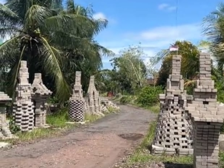 Di lapangan, paving blok yang telah didatangkan justru disusun rapi menyerupai bentuk candi dan gapura. Aksi warga itu disebut-sebut sebagai bentuk protes atas belum terealisasinya pembangunan jalan, bahkan sempat viral di media sosial.