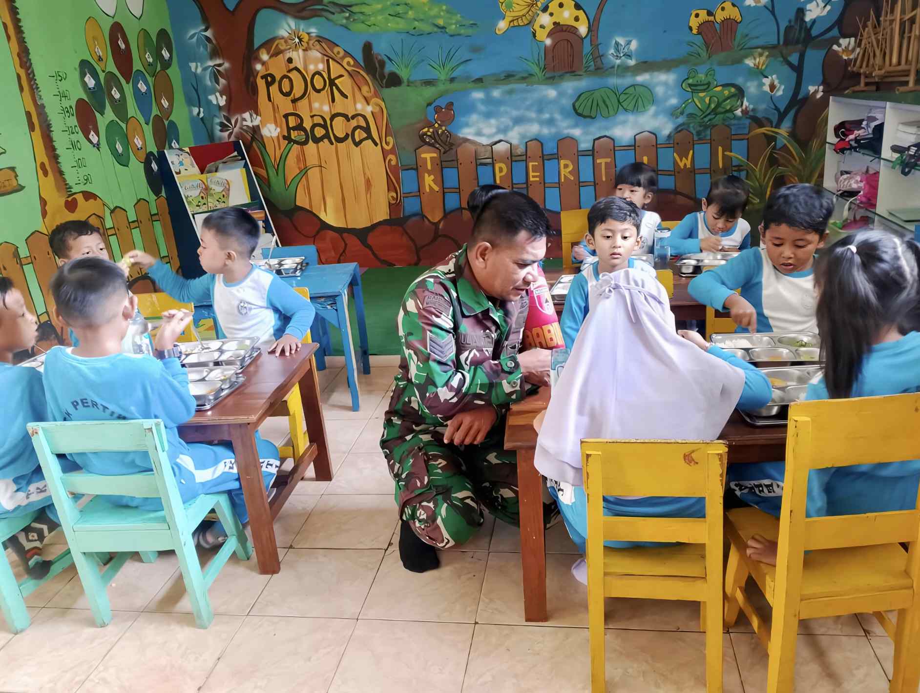Kegiatan Makan Bergizi Gratis di TK Pertiwi Desa Patemon berlangsung dengan penuh keceriaan dan kebersamaan, mencerminkan sinergi yang kuat antara pihak sekolah, pemerintah, dan TNI dalam mendukung terwujudnya generasi yang sehat dan berkualitas. (*/Rois)