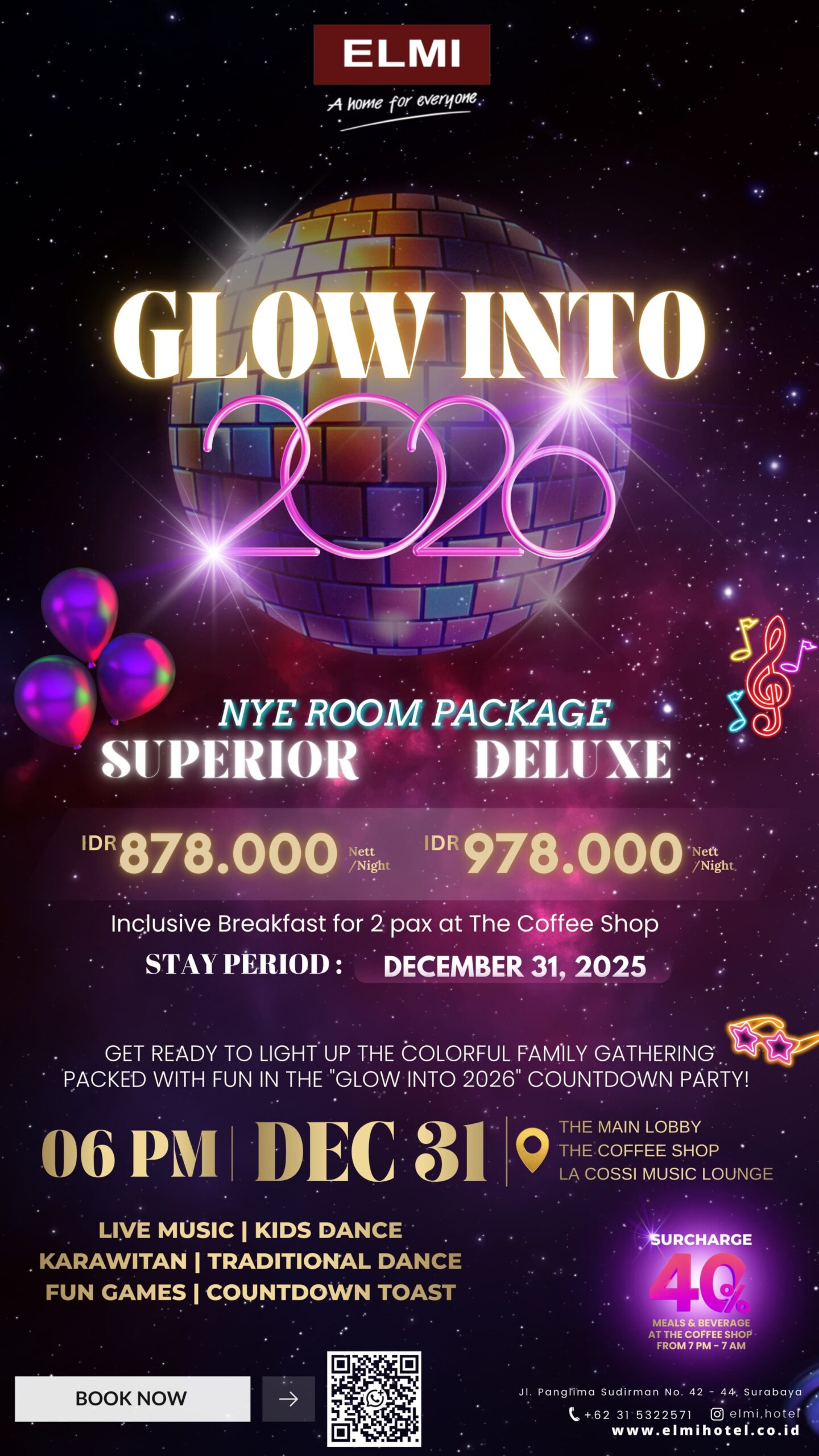 Surabaya, beritalima.com – Menyambut pergantian tahun, ELMI Hotel Surabaya kembali menghadirkan perayaan istimewa bertajuk “Glow Into 2026”, sebuah acara keluarga penuh warna yang siap memberikan pengalaman berlibur yang tak terlupakan. Melalui paket kamar spesial New Year’s Eve, para tamu dapat menikmati suasana malam tahun baru yang meriah lengkap dengan berbagai hiburan menarik.
