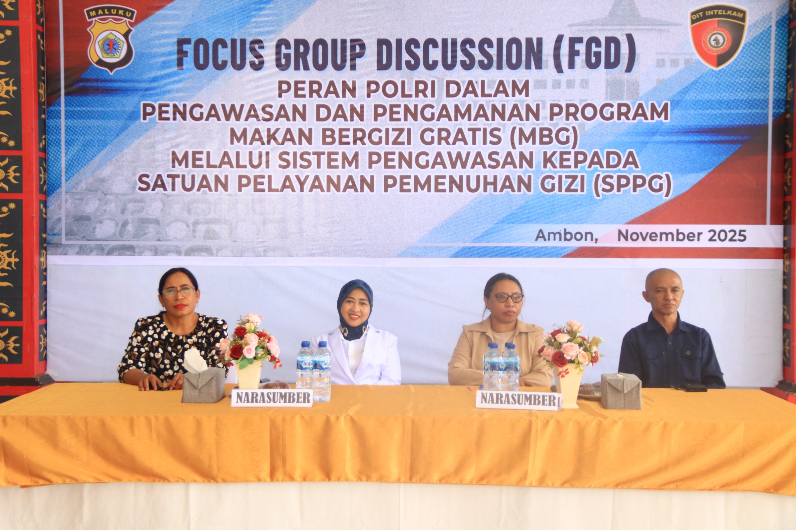 Ambon, – Direktorat Intelijen Keamanan (Dit Intelkam) Polda Maluku, menggelar Focus Group Discussion (FGD) dengan tema “Peran Polri dalam Pengawasan dan Pengamanan Program Makan Bergizi Gratis (MBG), melalui Sistem Pengawasan kepada Satuan Pelayanan Pemenuhan Gizi (SPPG)”, yang berlangsung di Ruang Sagu Plaza Presisi, Jumat (07/11/2025).