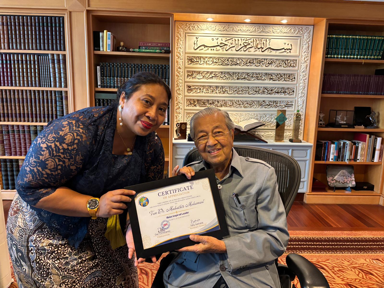 Penghargaan dari IWO kepada Mahathir Mohamad diserahkan Sekretaris Jenderal (Sekjen) IWO Telly Nathalia di kantor tokoh berpengaruh Asia itu di Yayasan Kepemimpinan Perdana di Putrajaya.