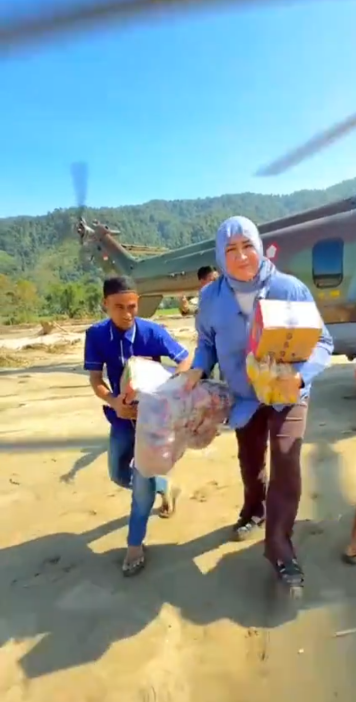 Untuk daerah yang benar-benar terisolir, distribusi logistik dilakukan menggunakan helikopter demi memastikan kebutuhan darurat tetap sampai ke tangan para korban banjir. Marlina menegaskan bahwa yang terpenting adalah bantuan, sekecil apa pun, bisa diterima oleh warga yang sedang mengalami kesulitan.