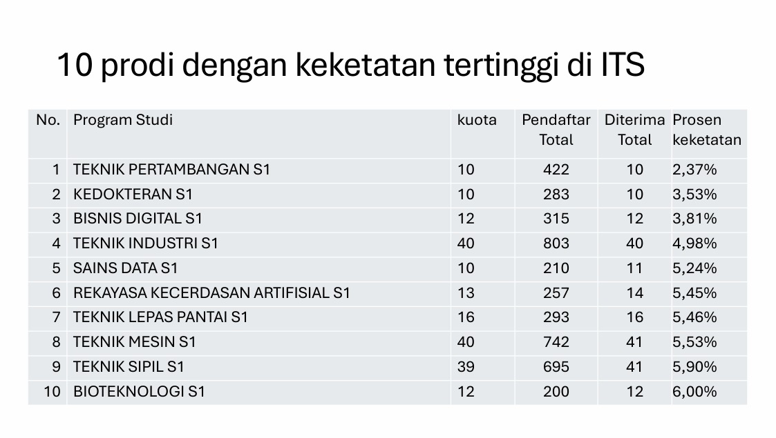 Menariknya, prodi dengan keketatan tertinggi di ITS jatuh pada Teknik Pertambangan yang baru saja membuka jalur selain Mandiri.