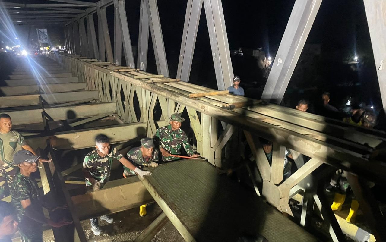 Aceh, beritalima.com| – TNI melalui Kodam Iskandar Muda kebut membantu pekerjaan pemulihan infrastruktur vital pascabencana banjir bandang dan tanah longsor Jembatan Bailey Teupin Reudeup di Kabupaten Bireuen, Provinsi Aceh siang dan malam (18/12).