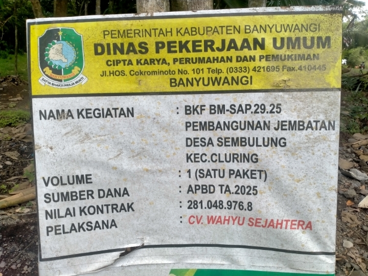 Untuk diketahui, pembangunan jembatan di Desa Sembulung ini bersumber dari Anggaran Pendapatan dan Belanja Daerah (APBD) Tahun Anggaran 2025, melalui Dinas Pekerjaan Umum, PUPR Cipta Karya, Perumahan dan Permukiman Kabupaten Banyuwangi, dengan nilai anggaran mencapai Rp281 juta.