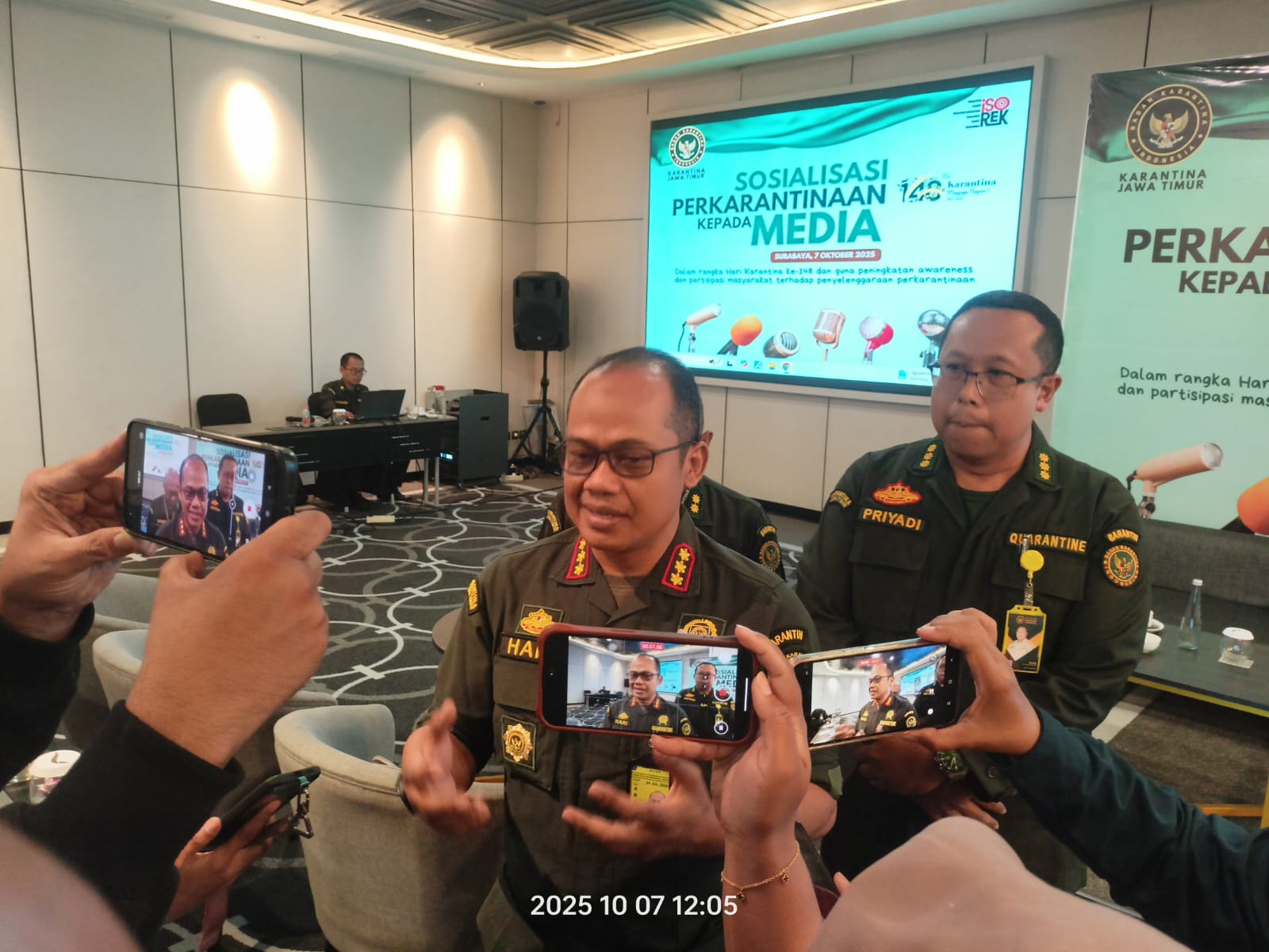 SURABAYA, beritalima.com | Badan Karantina Indonesia (Barantin) Balai Karantina Hewan, Ikan, dan Tumbuhan (Karantina) Jawa Timur gelar acara Sosialisasi Perkarantinaan Kepada Media, Selasa (07/10/2025).