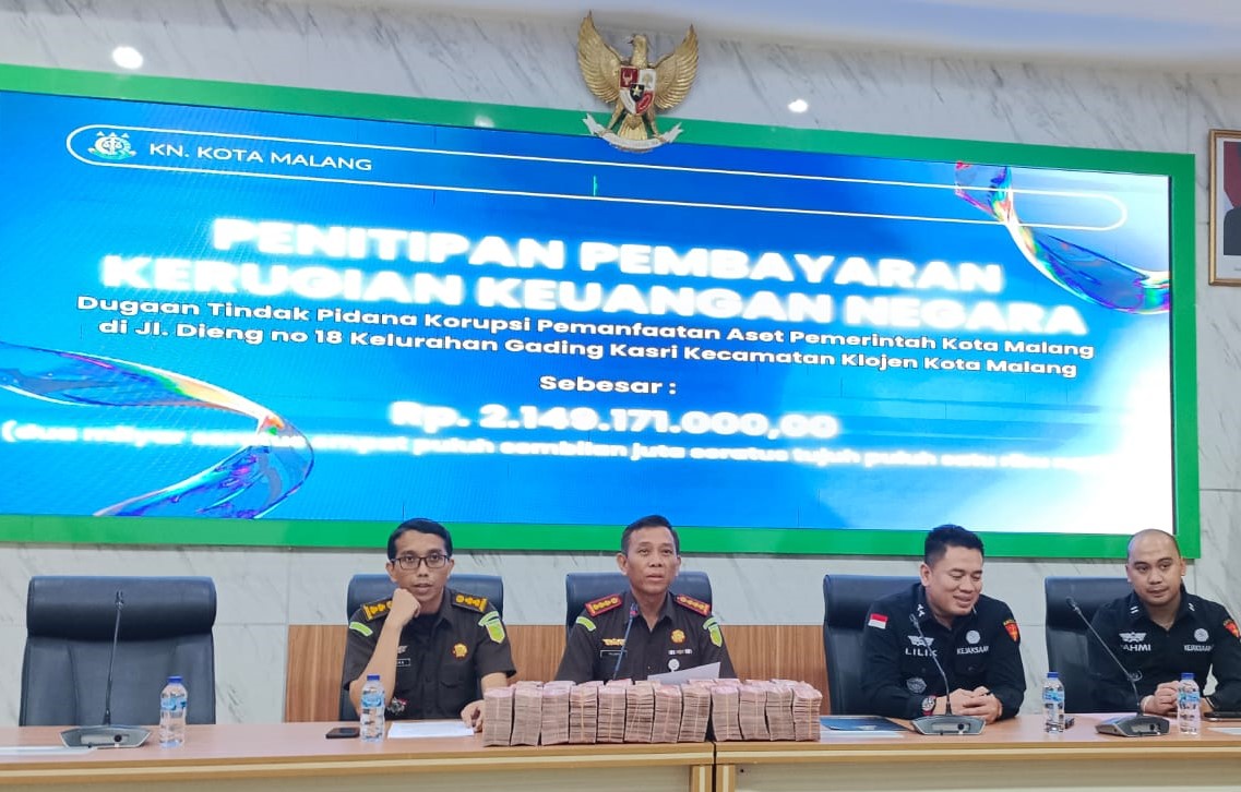 Malang, beritalima.com| – Tim Penyidik Seksi Tindak Pidana Khusus Kejaksaan Negeri?kejari Kota Malang terima Penitipan Pembayaran Kerugian Keuangan Negara/daerah sekitar Rp 2,1 miliar dalam Perkara Dugaan Tindak Pidana Korupsi Pemanfaatan Aset Pemerintah Kota Malang di Jl Dieng No 18 Kelurahan Gading Kasri, Kecamatan Klojen, Kota Malang (Jawa Timur) periode 2011-2025 dari Tersangka KS.
