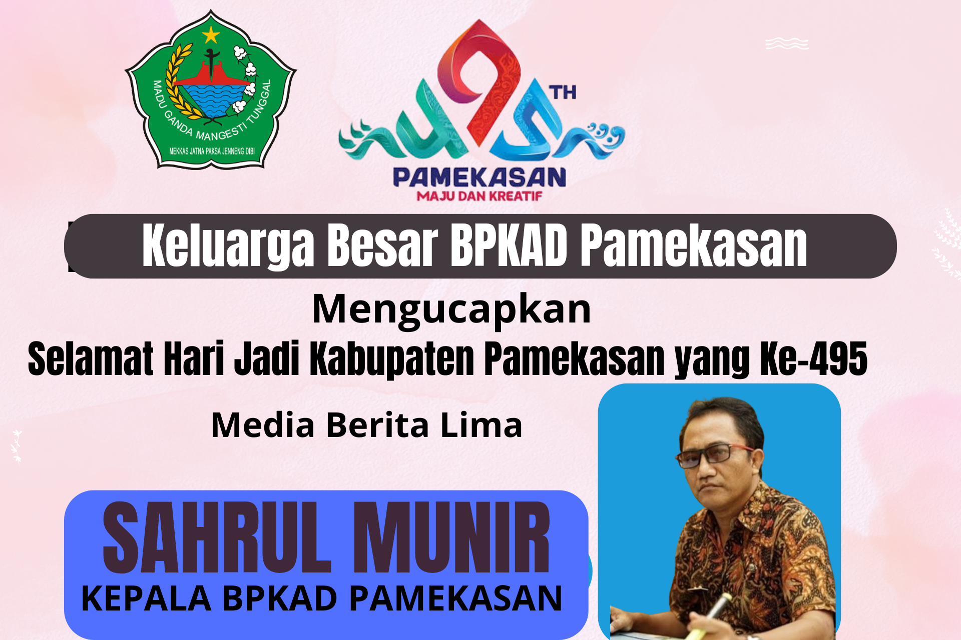 Keluarga Besar BPKPD Pamekasan Mengucapkan Selamat Hari Jadi kabupaten Pamekasan yang ke -495 redaktur PelaksanaKamis, 30 Oktober 2025 | 20:08 WIBSelasa, 4 November 2025 | 10:50 WIB515 views. Pos terkaitPolisi Pamekasan Ringkus 1 Orang Pelaku Penganiayaan yang Menyebabkan KematianWagub dan Sejumlah Bupati di Maluku Hadiri Rakor Pengelolaan Wilayah PerbatasanTepat di Hari Suci Galungan, Gubernur Maluku Resmikan Candi Bentar di AmbonPupuk Kaltim Tegaskan Komitmen Ketahanan Pangan Melalui One Day Promotion di NganjukSinergi BNI KC Tanjung Priok dan PMI Jakarta Utara Perkuat Misi Kemanusiaan A400M TNI AU Jalani Misi Perdana Mendarat di Aceh