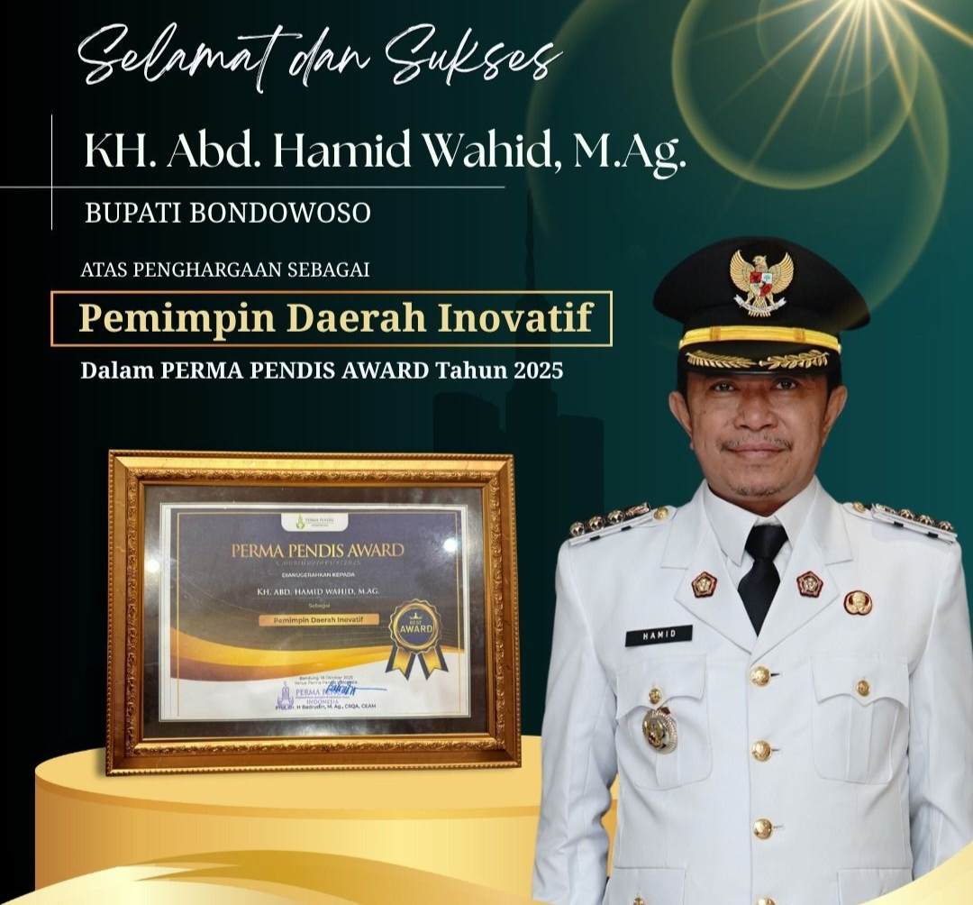 BONDOWOSO, beritalima.com – Bupati Bondowoso, Abd Hamid Wahid, bersama istrinya yang juga Ketua Tim Penggerak PKK, Dr. Khodijatul Qodriyah, berhasil meraih penghargaan bergengsi Perma Pendis Award 2025.