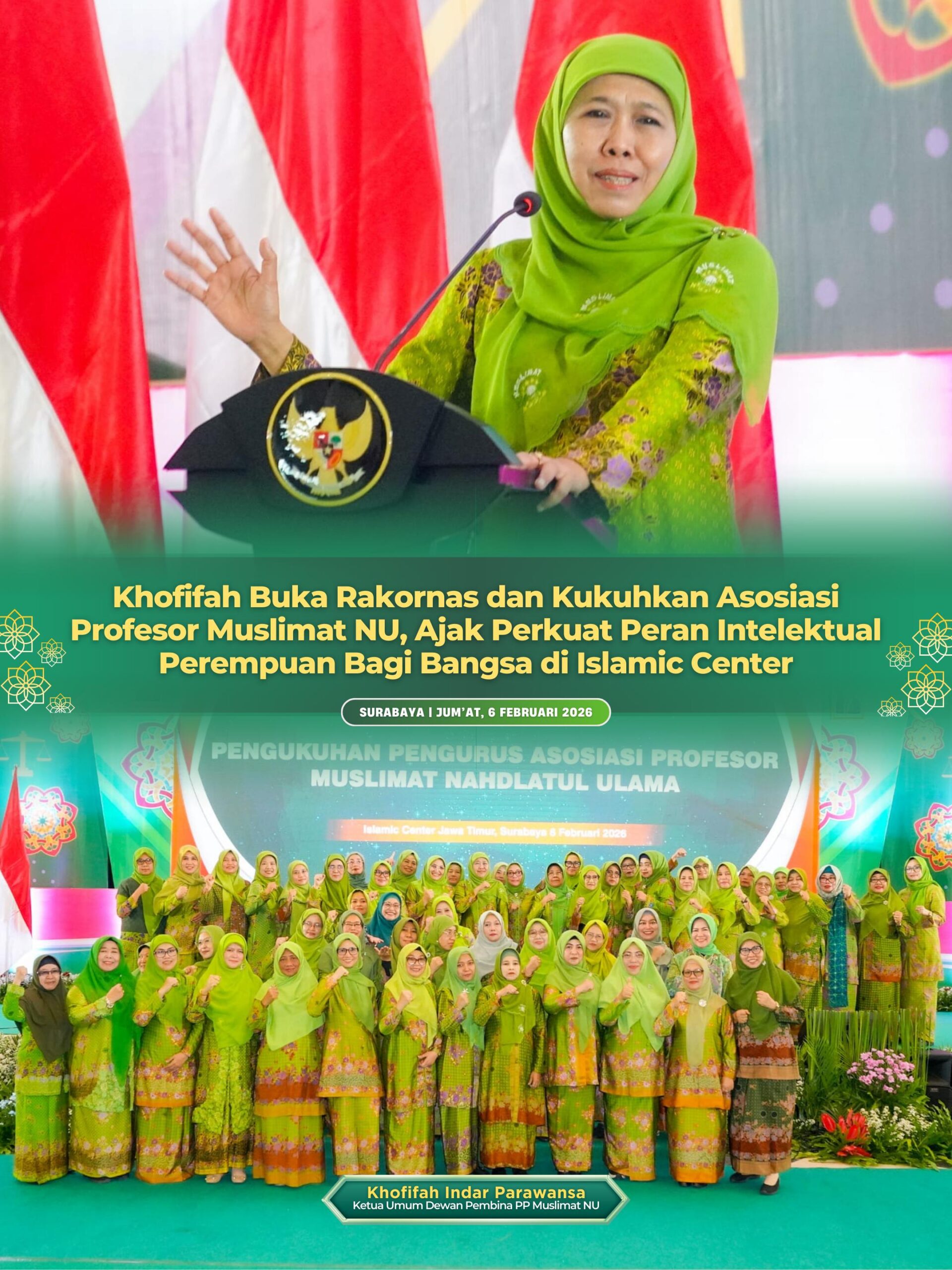 Ketua Umum Dewan Pembina PP Muslimat NU yang juga Gubernur Jawa Timur Khofifah Indar Parawansa membuka Rapat Koordinasi Nasional (Rakornas) Asosiasi Professor Muslimat Nahdlatul Ulama (APMNU) serta mengukuhkan pengurus APMNU yang digelar di Kantor Badan Pengembangan Sumber Daya Manusia (BPSDM) Provinsi Jawa Timur, Surabaya. Jum’at (6/2/2026) malam.