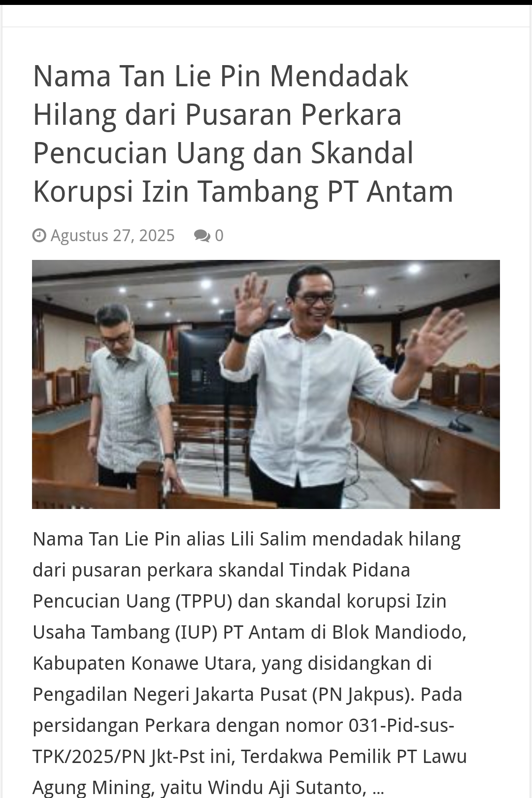 Redaksi beritalima.com telah memuat berita berjudul “Skandal Korupsi Izin Tambang PT Antam, Nama Tan Lie Pin Mendadak Hilang dari Pusaran Perkara Pencucian Uang”