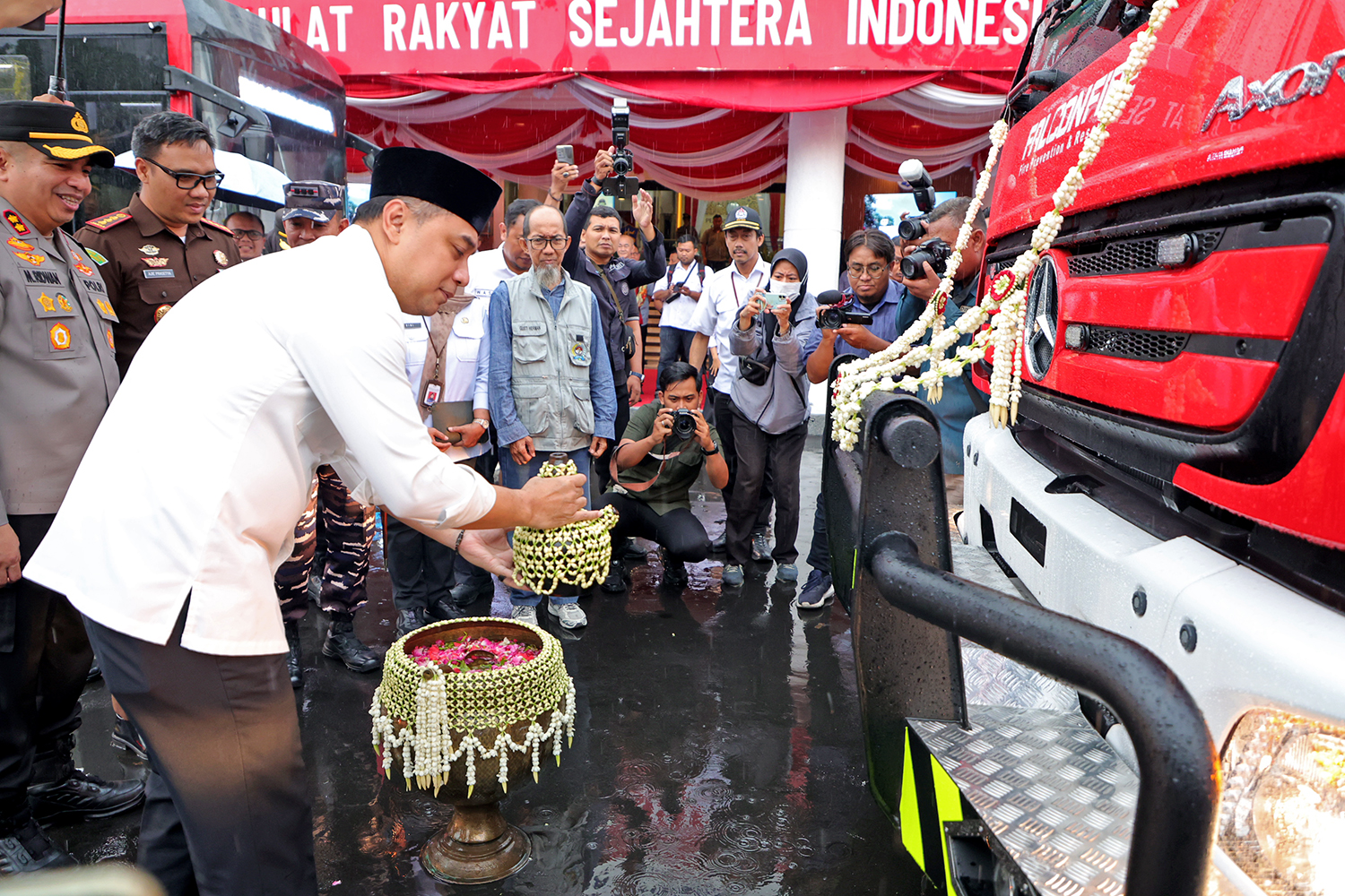 Surabaya, beritalima.com | Pemerintah Kota (Pemkot) Surabaya resmi memperkuat armada penyelamatan dengan meluncurkan sejumlah unit alat pemadam kebakaran berteknologi tinggi di Halaman Balai Kota Surabaya, Rabu (24/12/2025). Peluncuran ini dipimpin langsung oleh Wali Kota Surabaya, Eri Cahyadi, yang ditandai dengan penekanan sirine serta prosesi simbolis pemecahan kendi dan penyiraman air kembang bersama jajaran Forkopimda.