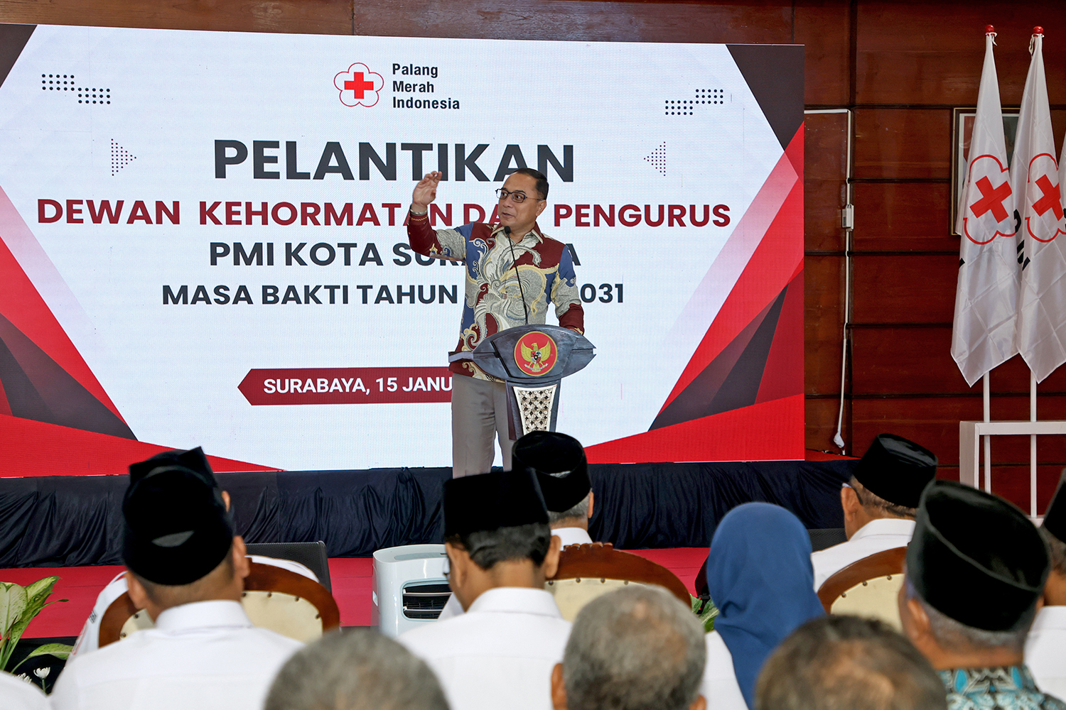 Surabaya, beritalima.com | Wali Kota Surabaya Eri Cahyadi menghadiri Pelantikan Dewan Kehormatan dan Pengurus Palang Merah Indonesia (PMI) Kota Surabaya masa bakti 2026–2031 di Kantor PMI Kota Surabaya, Jalan Embong Ploso, Kamis (15/1/2026). Melalui momentum tersebut, Pemerintah Kota (Pemkot) Surabaya menegaskan komitmennya dalam mendukung penguatan peran PMI sebagai garda terdepan layanan kemanusiaan.