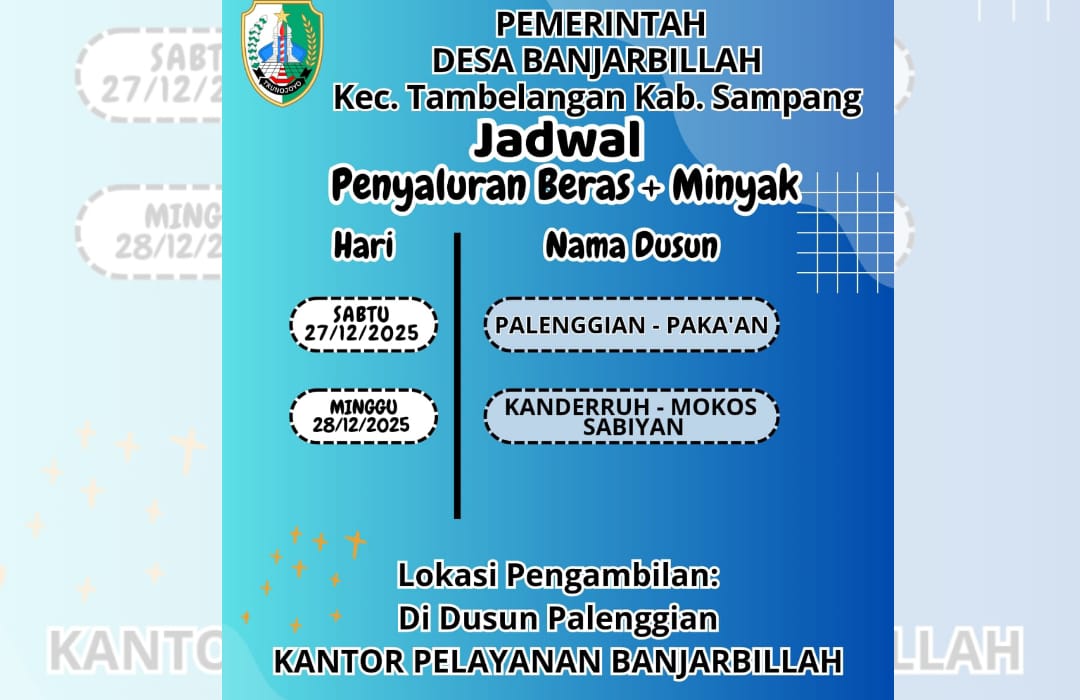 SAMPANG, Beritalima.com | Pemerintah Desa Banjarbillah, Kecamatan Tambelangan, Kabupaten Sampang, mengumumkan jadwal penyaluran bantuan berupa beras dan minyak goreng bagi warga di sejumlah dusun.