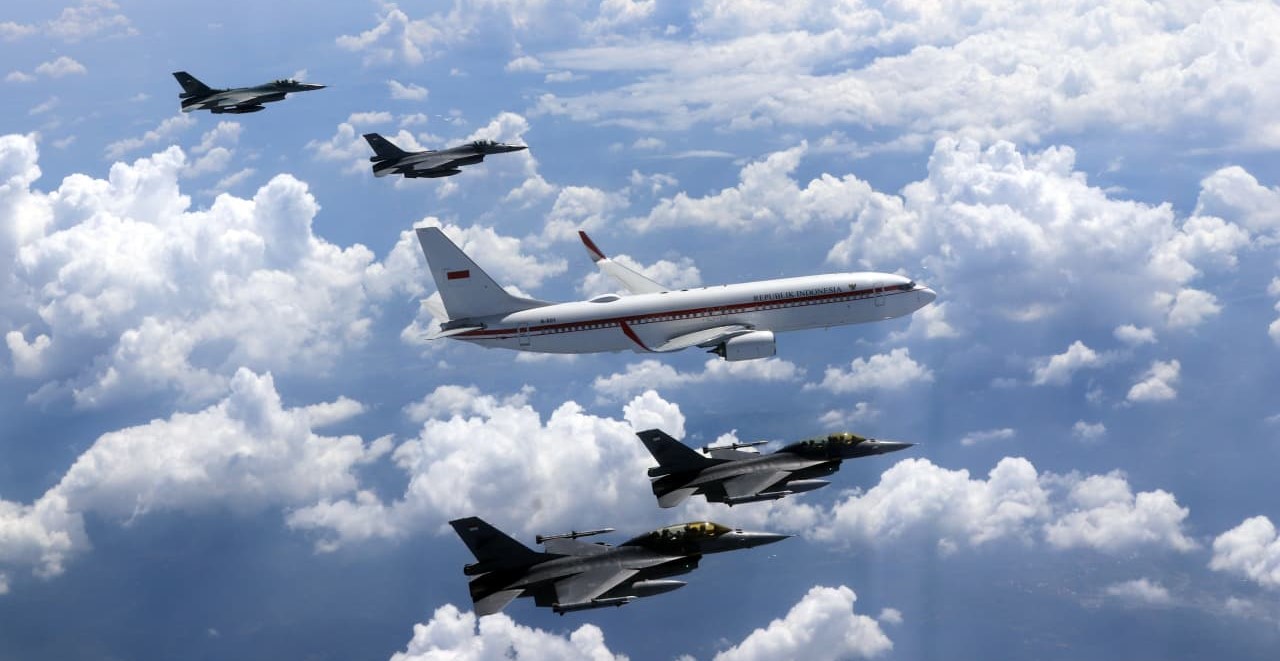 Jakarta, beritalima.com|- Empat pesawat tempur F-16 Fighting Falcon dari Skadron Udara 3 dan Skadron Udara 14 serta dua pesawat T-50i Golden Eagle dari Skadron Udara 15 yang tergabung dalam FOXTROT FLIGHT jalani misi patroli udara sekaligus pengawalan VVIP terhadap penerbangan pesawat kepresidenan pada peringatan Hut ke-80 TNI AU (9/4).