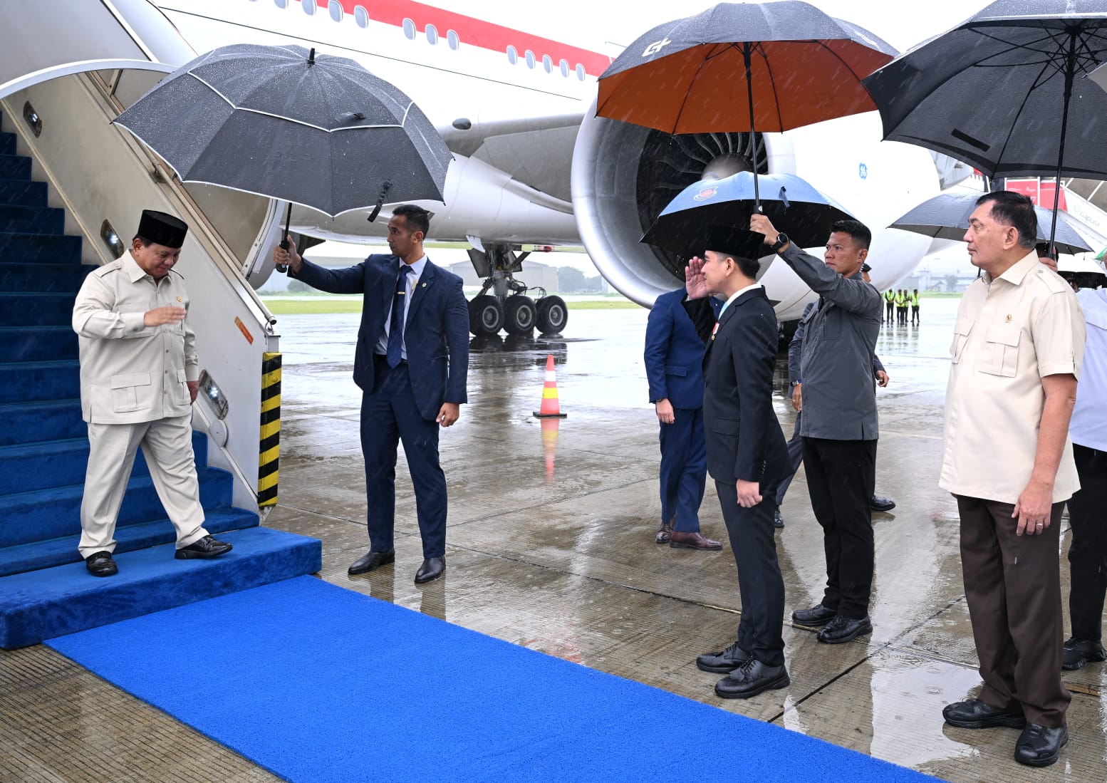 Ketibaan Presiden di Pangkalan TNI AU Halim Perdanakusuma disambut Wakil Presiden Gibran Rakabuming, Menteri Pertahanan Sjafrie Sjamsoeddin, Menteri Sekretaris Negara Prasetyo Hadi, Panglima TNI Jenderal Agus Subiyanto, dan Kapolri Jenderal Listyo Sigit Prabowo.