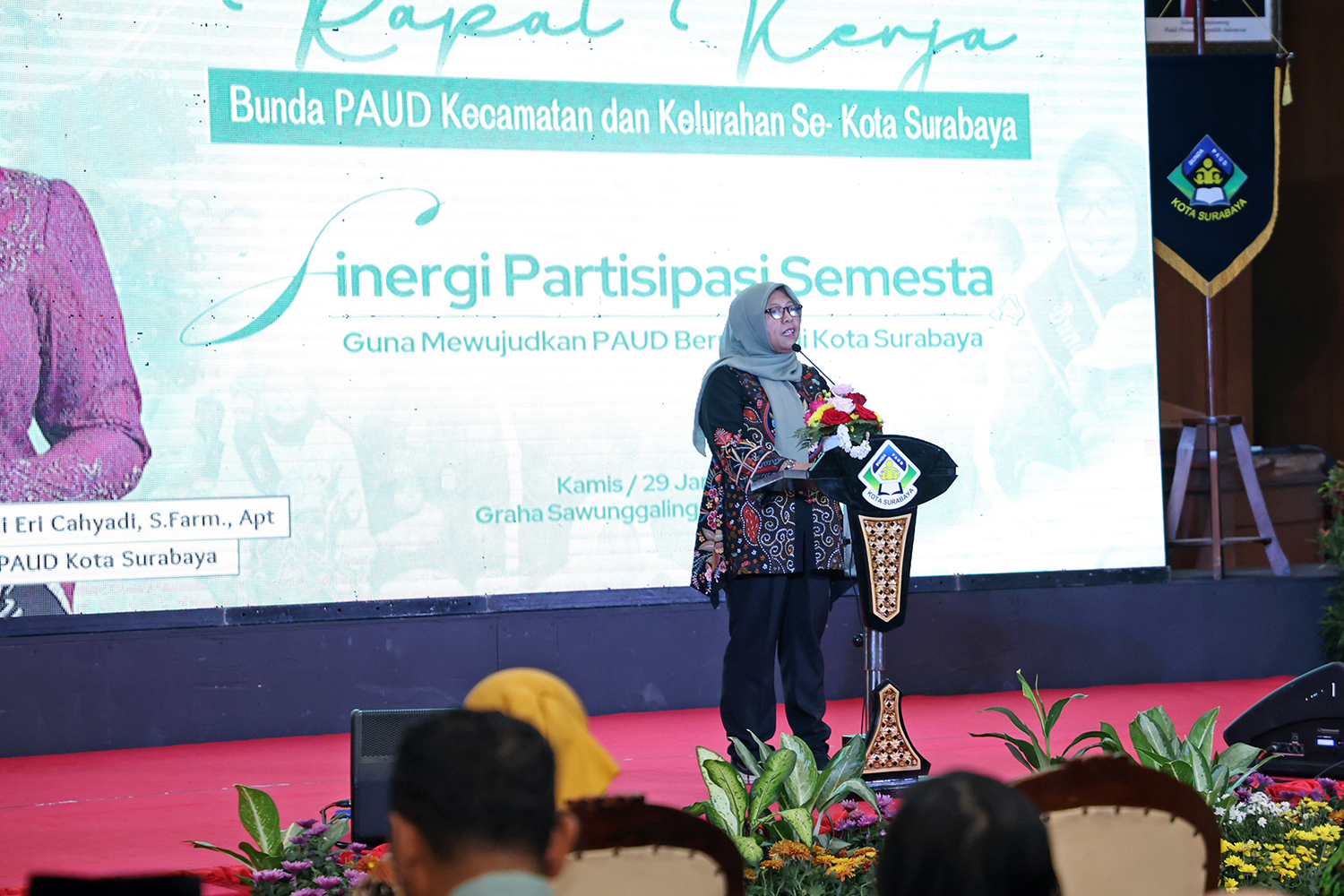 Surabaya, beritalima.com | Pemerintah Kota (Pemkot) Surabaya bersama Bunda PAUD Surabaya menggelar Rapat Kerja Bunda PAUD Kecamatan dan Kelurahan se-Kota Surabaya, bertema Sinergi Partisipasi Semesta Guna Mewujudkan PAUD Bermutu di Kota Surabaya, di Graha Sawunggaling, Kamis (29/1/2026). Kegiatan ini menjadi momentum untuk memperkuat peran seluruh pemangku kepentingan dalam membangun pendidikan anak usia dini yang berkualitas dan merata.