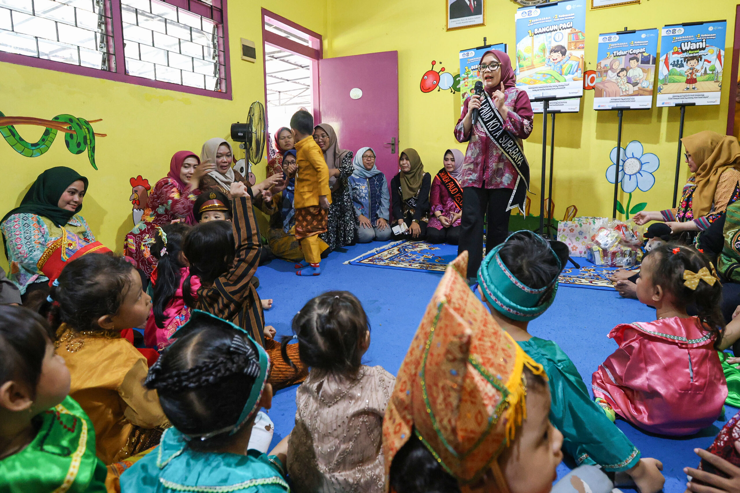 Surabaya, beritalima.com | Memperingati Hari Kartini yang jatuh setiap bulan April, Pemerintah Kota (Pemkot) Surabaya bersama Bunda PAUD Kota Surabaya, Rini Indriyani, melakukan kunjungan ke sejumlah Pos PAUD Terpadu (PPT) pada Kamis (16/4/2026). Kunjungan ini bertujuan untuk mengasah imajinasi dan literasi anak usia dini melalui metode mendongeng.