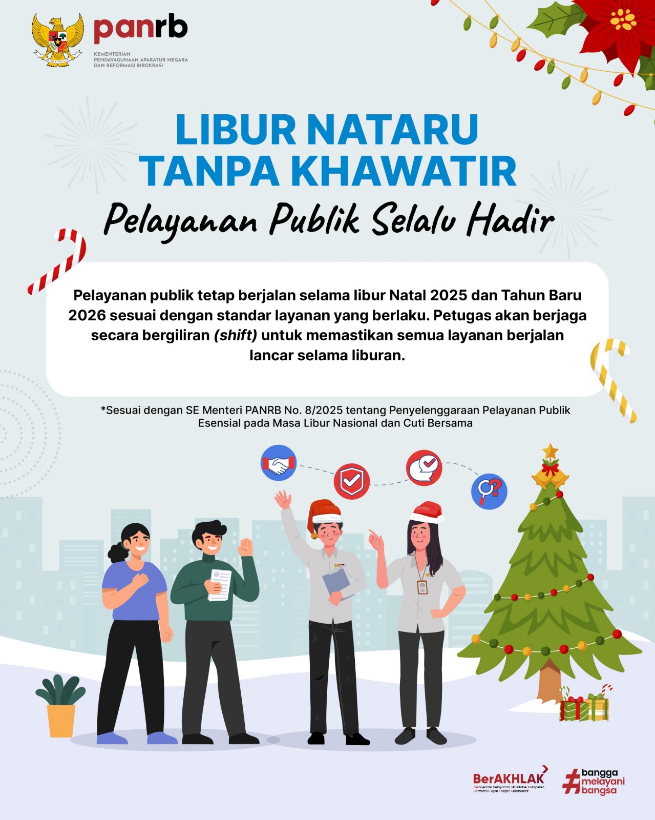 Jakarta | beritalima.com – Untuk menjamin pelayanan tetap optimal, Menteri Pendayagunaan Aparatur Negara dan Reformasi Birokrasi (PANRB) Rini Widyantini mengimbau agar pelayanan kepada masyarakat selama libur Natal dan Tahun Baru (Nataru) tetap berjalan dengan berbagai penyesuaian yang diperlukan. Imbauan ini tertuang dalam Surat Edaran Menteri PANRB No. 8/2025 tentang Penyelenggaraan Pelayanan Publik Esensial pada Masa Libur Nasional dan Cuti Bersama.