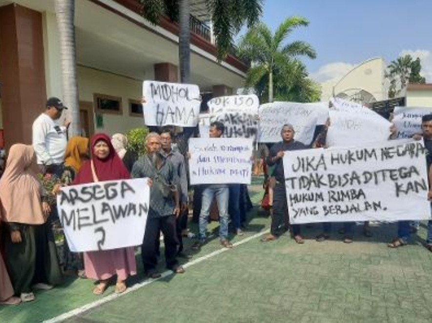 Dalam menuntut keadilan tersebut, warga membentangkan poster berisi tuntutan dan kecaman di Halaman PN Gresik.