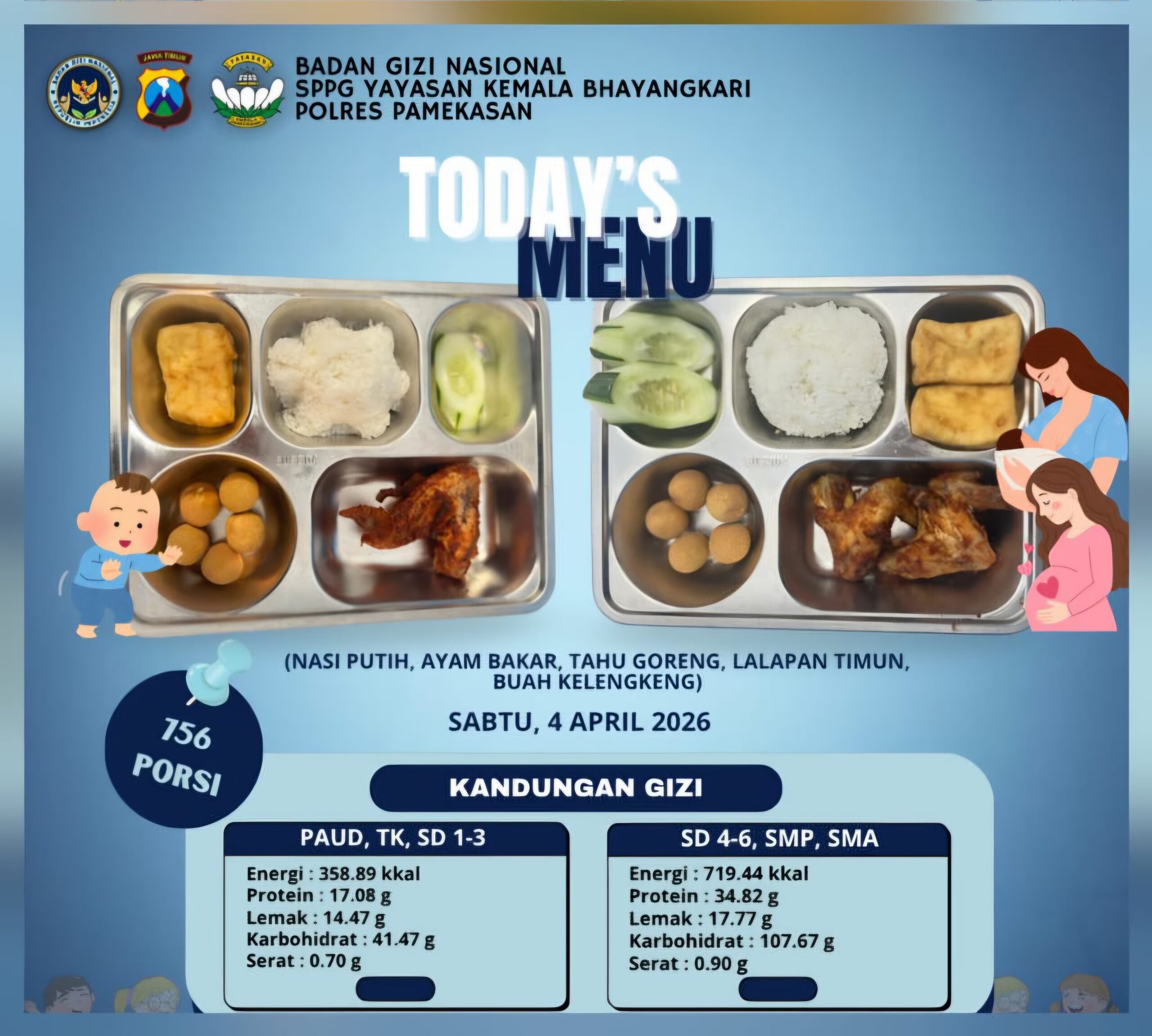 PAMEKASAN, Beritalima.com – Satuan Pelayanan Pemenuhan Gizi (SPPG) Yayasan Kemala Bhayangkari Polres Pamekasan terus berkomitmen dalam mendukung program penguatan gizi nasional melalui pendistribusian makanan bergizi seimbang. Pada hari Sabtu, 4 April 2026, sebanyak 2.449 porsi makanan sehat telah berhasil disalurkan kepada berbagai elemen masyarakat di wilayah Pamekasan.