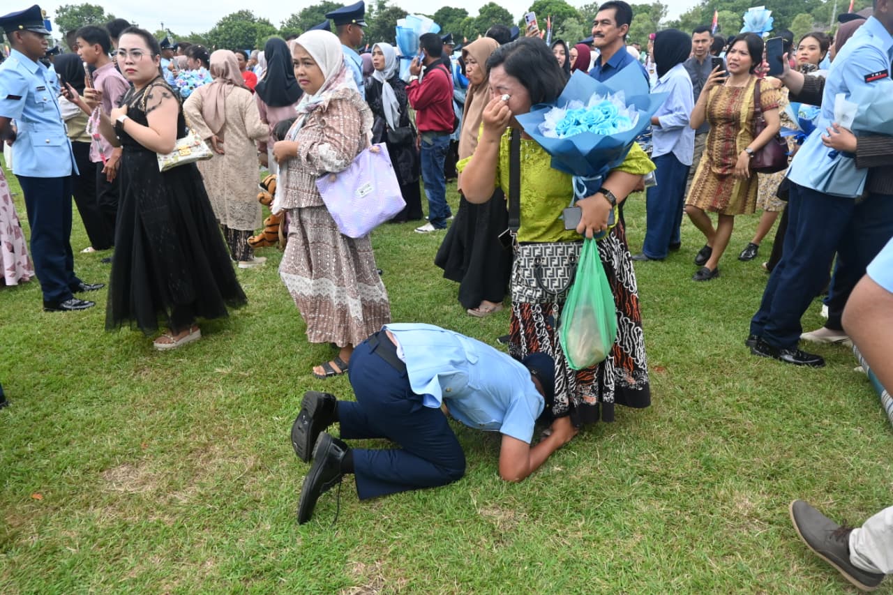 Tampak sejumlah prajurit yang baru lulus tak kuasa menahan tangis, mencium kaki orang tuanya serta larut dalam kegembiraan bersama.