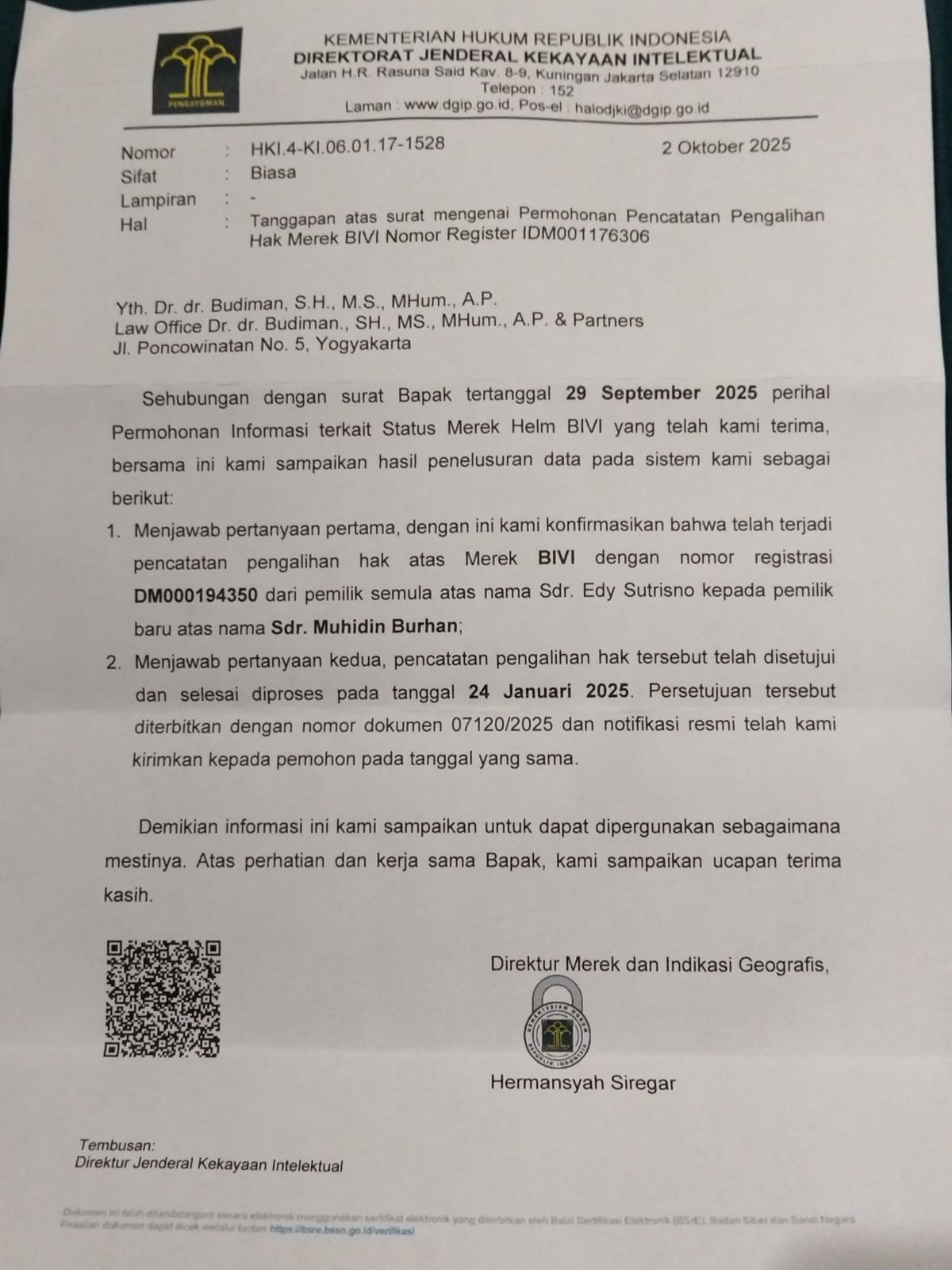 “Ternyata merek BIVI baru dilaporkan pada Dirjen HAKI merek thn 2025. Pelapor malah terdeteksi memalsukan SNI dan helm yg selama di jual eceran setelah dicek semua ga sesuai standar SNI dan hasil verifikasi sdh dikonfirmasi badan standardisasi nasional dan kementerian perdagangan,” terang IW kepada wartawan beritalima.com ini.