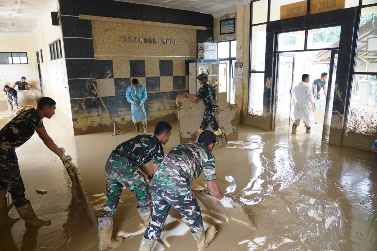 (Puspen TNI), beritalima.com | TNI mengerahkan 100 prajurit Yonif Teritorial Pembangunan (TP) 853/Bawar Reje Bur, Kodam Iskandar Muda, untuk membantu pembersihan fasilitas utama Rumah Sakit Umum Daerah (RSUD) Aceh Tamiang yang terdampak banjir dan tanah longsor, di Kabupaten Aceh Tamiang, Jumat (19/12/2025).